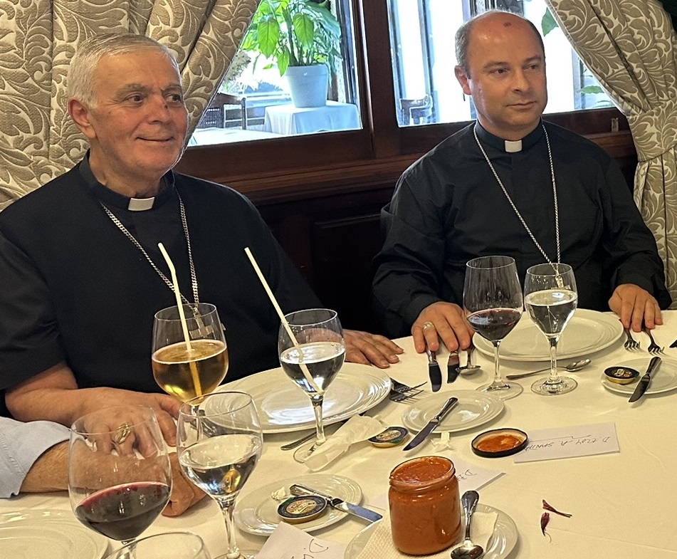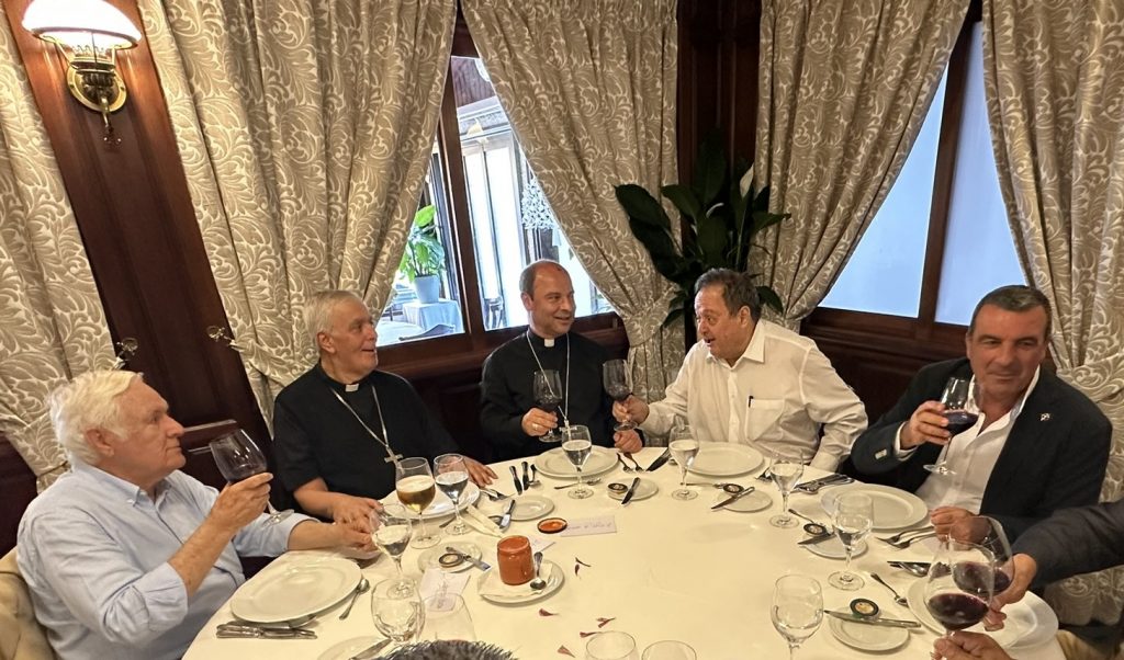 - Especialmente significativo y gratificante fue ver la actitud de nuestro nuevo obispo, Eloy Santiago, pendiente y atendiendo en todo momento a nuestro obispo emérito, Bernardo Álvarez. Desde su llegada al restaurante Los Limoneros y hasta la despedida, Eloy Santiago protagonizó un enriquecedor ejemplo de atención, sensibilidad y dedicación, claramente explicable si recordamos el lema que nuestro nuevo obispo ha escogido para su episcopado, “ut ministraret” que en “cristiano” viene a significar “para servir”. Y es que, todas las limitaciones que la puñetera ELA está produciéndole a Bernardo Álvarez, fueron solventadas con espíritu de servicio por Eloy Santiago, de la manera más sencilla y natural. Lo dicho, todo un ejemplo. Por cierto: Bernardo Álvarez sigue haciendo gala de su “Mojo Rojo Episcopal” a base de pimienta palmera, que, aunque quizá ya no elabore con sus propias manos, se ocupa personalmente de dirigir la elaboración y lo sigue “cuadrando” en sabor.