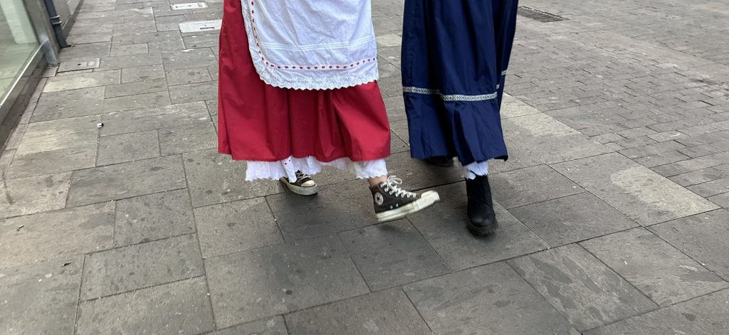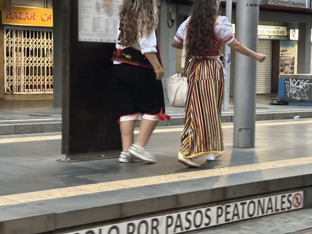 Una chica (mujer) vestida de “mago” (hombre) sin polainas y tenis (i) y al lado su compañera, también con tenis y bolso de marca, yendo de la parada del tranvía al” botellón mago”.