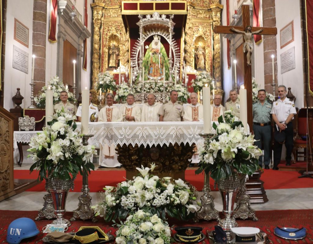- Remato El Cotarro de hoy con mi casi ya habitual reseña dedicada a nuestras Fuerzas Armadas. Con motivo de la visita de la Sagrada Imagen de Nuestra Señora la Virgen de Candelaria a la capital tinerfeña, cada día, personas, entidades y colectivos de todas clases se acercan a la Parroquia Matriz de Nuestra Señora de la Concepción, para postrarse los pies de “La Morenita” y rezarle, pedirle o agradecerle lo que cada persona íntimamente desea. El pasado martes lo hizo la “Familia Castrense” encabezada por el teniente general Julio Salom, jefe del Mando de Canarias, junto con representación de los tres ejércitos, la Guardia Civil y la Policía Nacional. Quiero reseñar dos detalles conmovedores que se produjeron durante el transcurso de la Eucaristía celebrada. En el momento de las ofrendas, militares de cada cuerpo entregaron (y fueron depositados a los pies de la Virgen) una gorra del Ejército de Tierra, otra Ejército del Aire y del Espacio, otra de la Armada, otra de la Policía Nacional, un tricornio de la Guardia Civil y lo más conmovedor, un casco azul de la ONU y una gorra azul, en representación de los militares de Canarias que están desplegados por medio mundo en misiones de paz, trabajando profesionalmente y muchas veces jugándose la vida, lejos de su tierra.