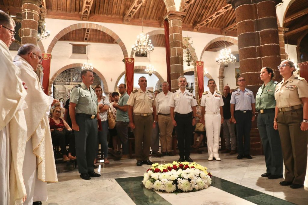- Debo reseñar que, durante la misa, presidida el páter capellán castrense Ramón García Guardado y concelebrada, entre otros sacerdotes, por el también capellán castrense, Marcos J. Albertos Albertos, se contó en varios momentos de la misma (en las lecturas, la oración de los files, etc.) con la colaboración de militares de los tres ejércitos, la Guardia Civil y la Policía Nacional y que, toda la celebración, tuvo acompañamiento musical a cargo de una sección de la Unidad de Música del Mando de Canarias, bajo la dirección del capitán Manuel Castrejón Navarro. El otro momento que puso a todos los pelos de punta fue cuando, al final de la misa, se realizó en el interior del templo el homenaje a todos los Caídos que, en algún momento de la historia, han dado su vida por España. El acto se desarrolló ante la sepultura del general Antonio Gutiérrez de Otero y Santayana, quien, en mayo de 1797, al frente de sus tropas, defendió nuestra isla del ataque de la Armada Inglesa con el contralmirante Horacio Nelson al frente. En el acto se interpretó y fue cantado por muchas de las personas que estaban presentes el siempre emotivo tema “La muerte no es el final”, para concluir con el “Toque de Oración” tras haberse depositado sobre la sepultura del general Gutiérrez una corona de flores.