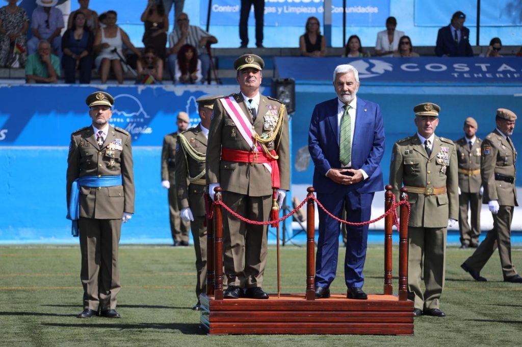 - En su alocución, el coronel Cherino felicitó a todos los jurandos por protagonizar uno de los actos más solemnes y trascendentes al que un español puede aspirar: el Juramento o Promesa a la Bandera de España. Les dio la enhorabuena por ser un grupo de ciudadanos que, sin importar clase social, profesión o condición, acababan de demostrar públicamente un profundo amor por su país, decidiendo refrendar de una forma activa y sincera la defensa de nuestra Constitución, nuestros valores y principios, derechos y libertades a través del compromiso público de defender a España y sus intereses. Pero hay que reseñar que, entre ellos y en un gesto que le honra, estaba como uno más, el propio alcalde de Adeje, José Miguel Rodríguez Fraga, dando un ejemplo de patriotismo bien entendido. El mismo José Miguel Rodríguez Fraga puso en sus redes sociales que: “Nuestros vínculos con las Fuerzas Armadas son diversos y estamos trabajando en distintos proyectos de interés para nuestro municipio y la ciudadanía adejera. La labor del Ejército en tiempo de paz es de enorme valor social y siempre apoyaremos ese trabajo”. Sin duda alguna, este acto es una muestra más de hermanamiento entre los ciudadanos de la Histórica Villa de Adeje y las Fuerzas Armadas, resaltando que la sociedad y el Ejército de Tierra están unidos por los mismos lazos.
