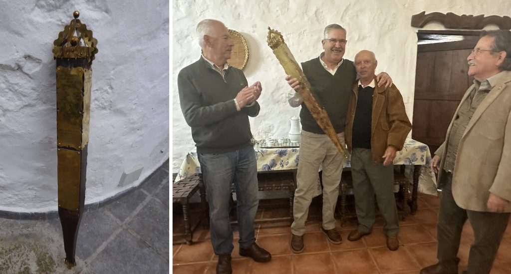 “La Macana” (i) con las placas que llevan los nombres de todos los que han sido “Macanas”, y, a la derecha, momento del relevo en el que Esteban Barreto entrega “La Macana” a Francisco González Aledo, con Fernando Hernández-Abad (i) y Antonio De la Cruz de testigos.