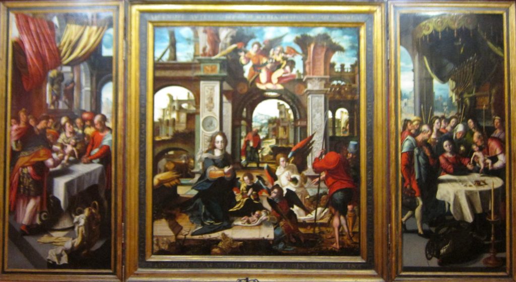 Esta pintura al óleo sobre tabla, realizada en 1546 por el célebre pintor Pieter Coecke van Aelst (Bélgica 1502-1550), que mide 190 x 192 cm en la tabla central, y 194 x 95 cm, cada una de las tablas laterales, se desarrolla en una estancia claramente influida por la arquitectura renacentista italiana, donde la sucesión de sus tres planos es interrumpida en el plano medio por masas arquitectónicas de ruinas clásicas. El equilibrio de su composición es completo, tanto en la agrupación de personajes como en los adecuados timbres de color. Los adornos están tratados con mucha delicadeza.