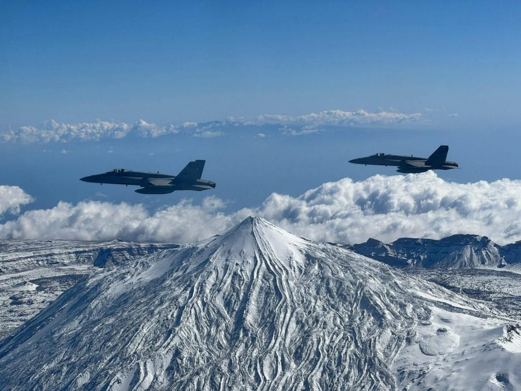 Aviones del Ala 46 del Ejército del Aire y del Espacio (EAE) sobrevolando el «padre» Teide nevado, el mes de diciembre de 2025 (Foto: EAE)