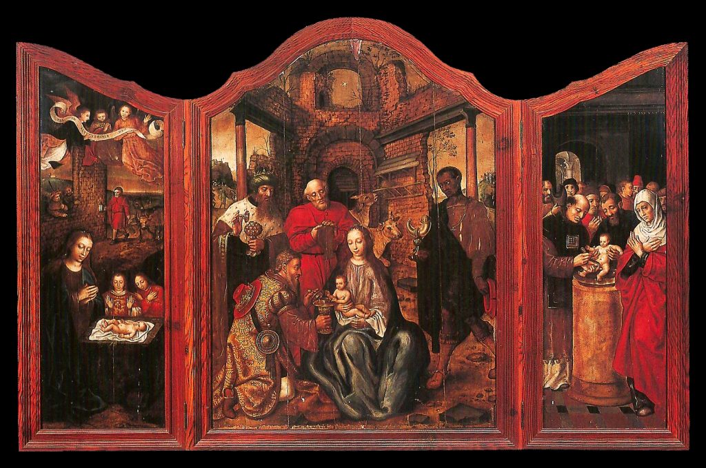 Esta pintura al óleo sobre tabla, realizado en la Escuela de Amberes (Bélgica) por Marcellus Coffermans, en 1575, representa tres escenas de la infancia de Jesús. La central de 119 cm de alto por 90 cm de ancho, y las dos laterales, de 94 y 116 cm de alto, por 40 cm de ancho.